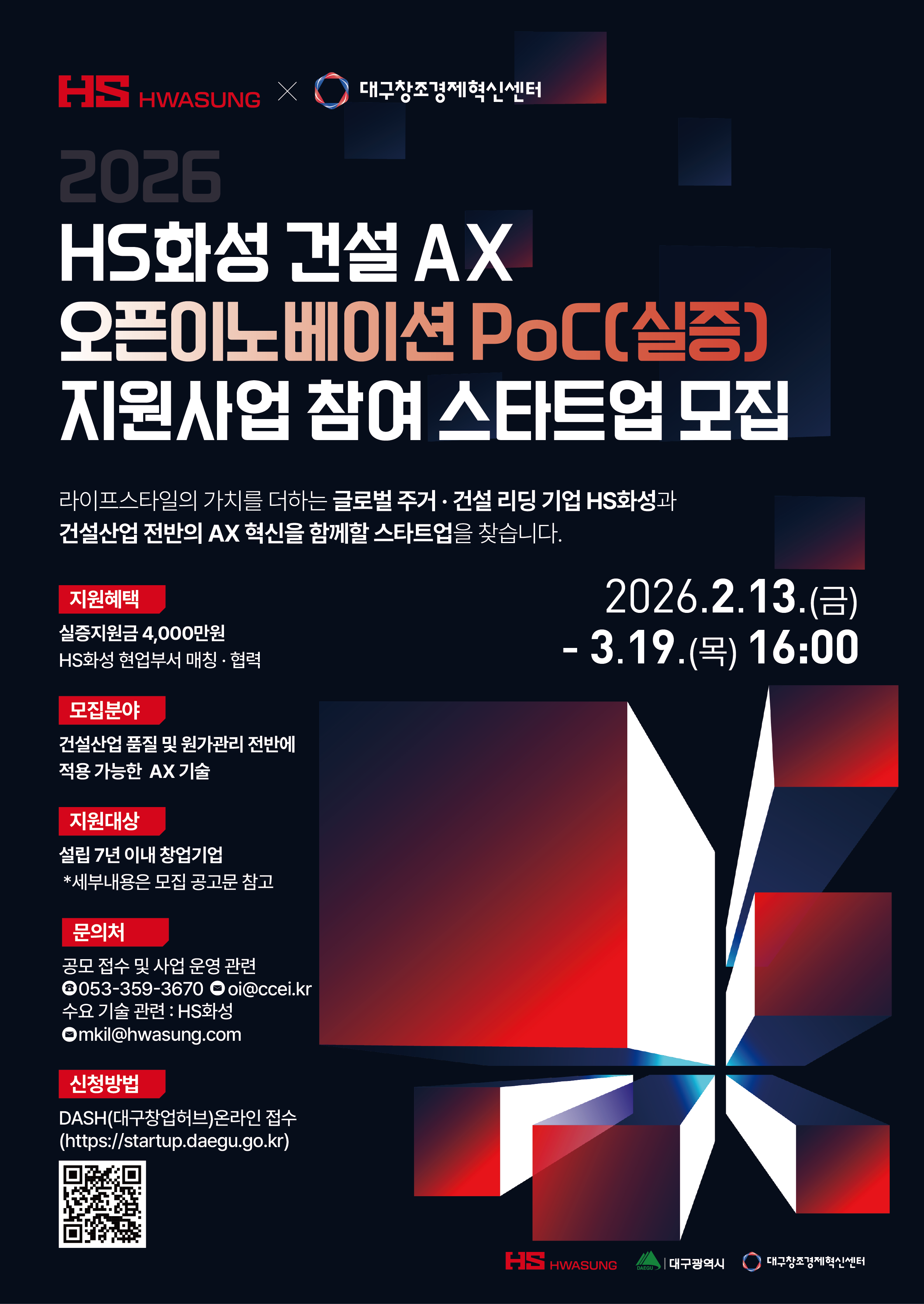 모집마감(2. 13. ~ 3. 19.) [HS화성] 2026년 HS화성 건설 AX 오픈이노베이션 PoC(실증) 지원사업 참여 스타트업 모집 공고
