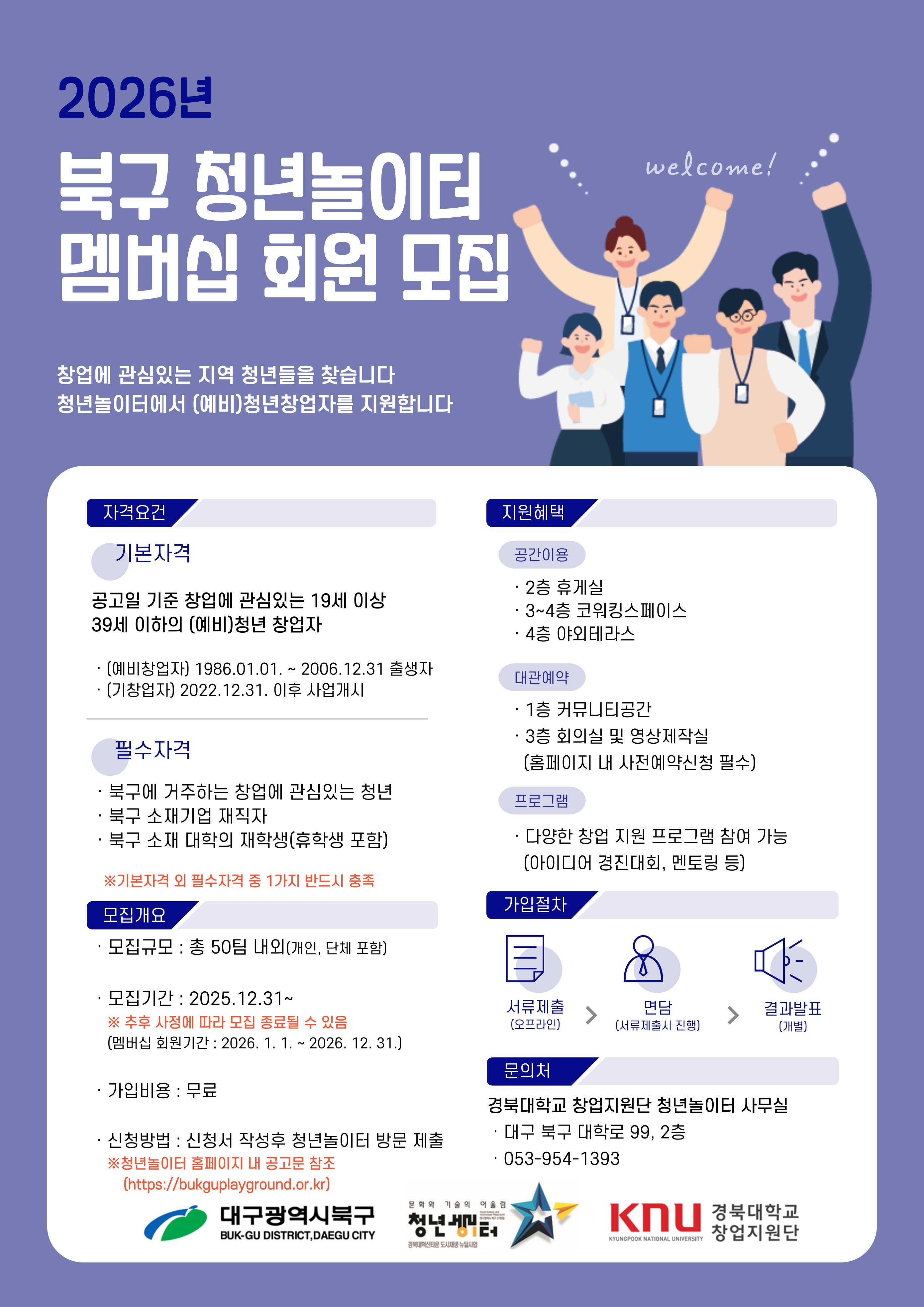 ■ 경북대학교 창업지원단에서는 '대구 북구 창업놀이터' 입주기업을 모집하오니 많은 관심 바랍니다. ※ 자세한 내용은 첨부파일의 공고문을 참고해주시기 바랍니다. &n...