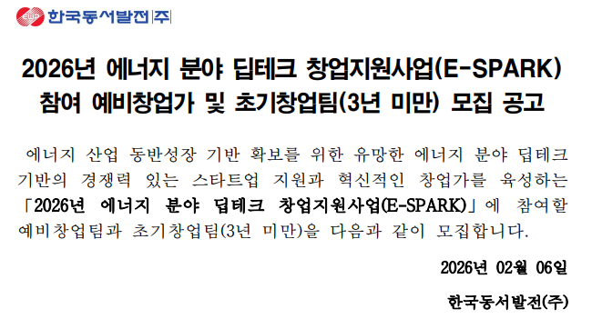 모집중(2. 6. ~ 3. 2.) [한국동서발전] 2026년 에너지 분야 딥테크 창업지원사업(E-SPARK) 참여 예비창업가 및 초기창업팀(3년 미만) 모집 공고